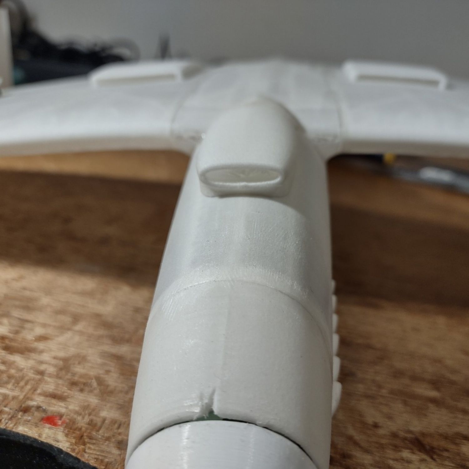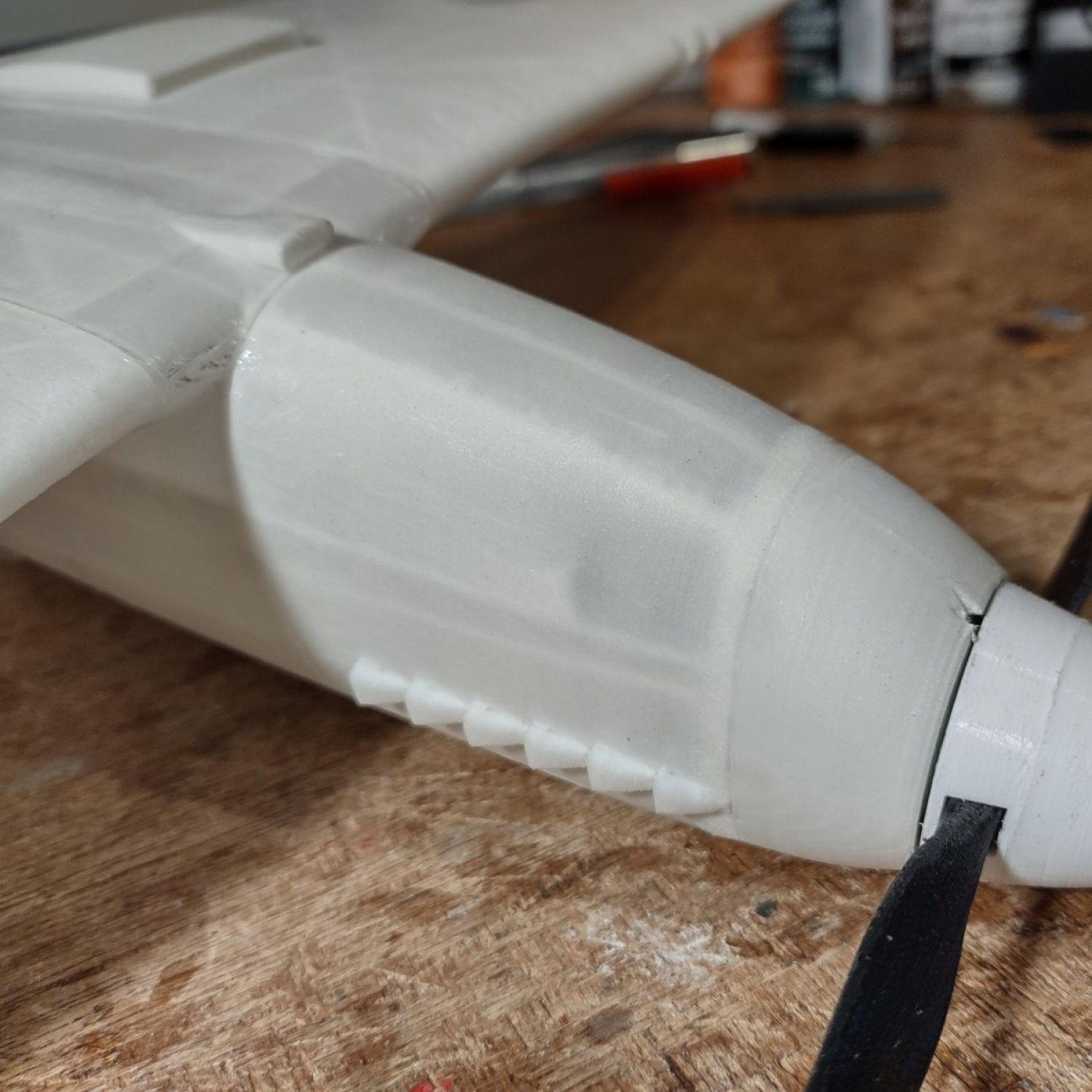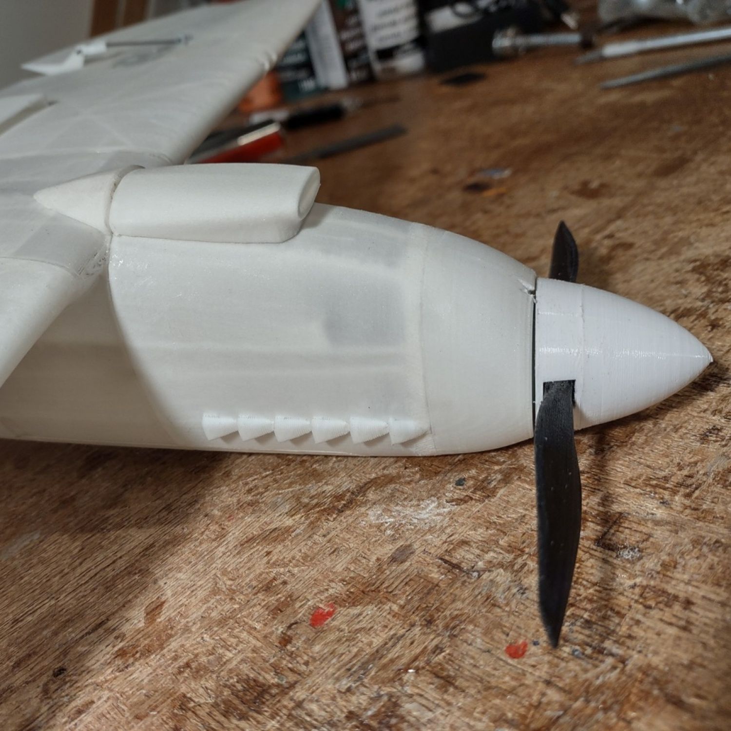 Simply print in LW-PLA along with the other parts and after assembly, simply slide in the new air scoop over the existing one located under side the fuselage at the leading edge.